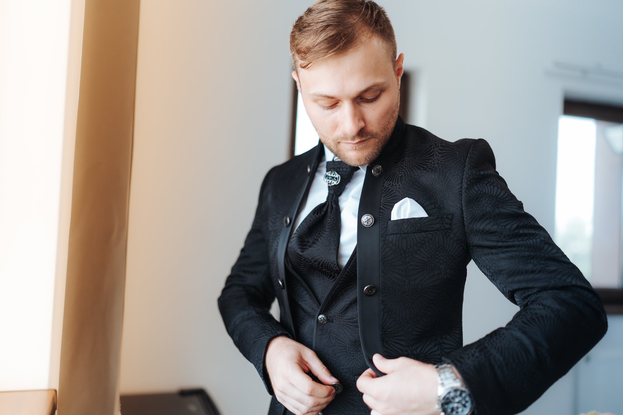 În paralel, pregătirile mirelui au o energie diferită. De cele mai multe ori, atmosfera este relaxată, plină de glume și prietenie. Ajustarea costumului, ultimele detalii și reacțiile prietenilor creează cadre naturale care completează perfect povestea zilei. Aceste momente aparent simple sunt cele care dau autenticitate întregii povești.